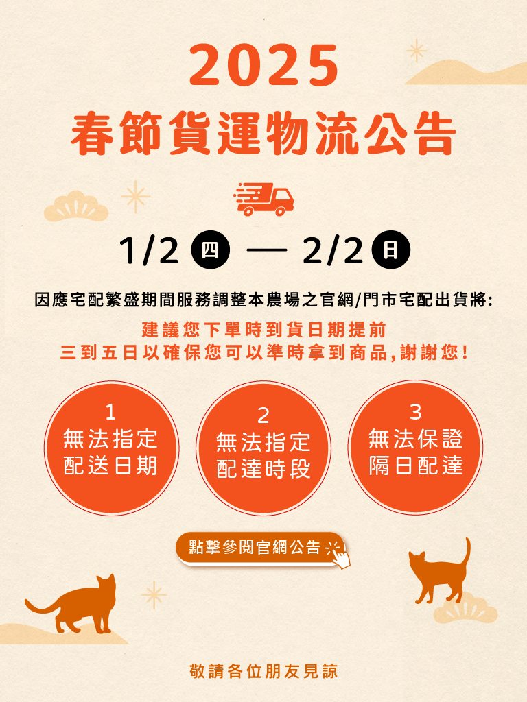 本農場之官網/門市宅配出貨服務,於即日起~2/2 (日) 將因應年節宅配貨運繁盛期間調整服務 :