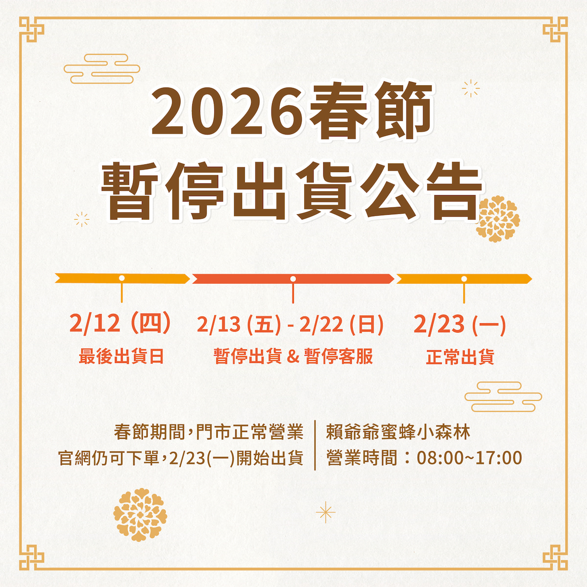 2026 春節最後出貨日&暫停出貨日 公告