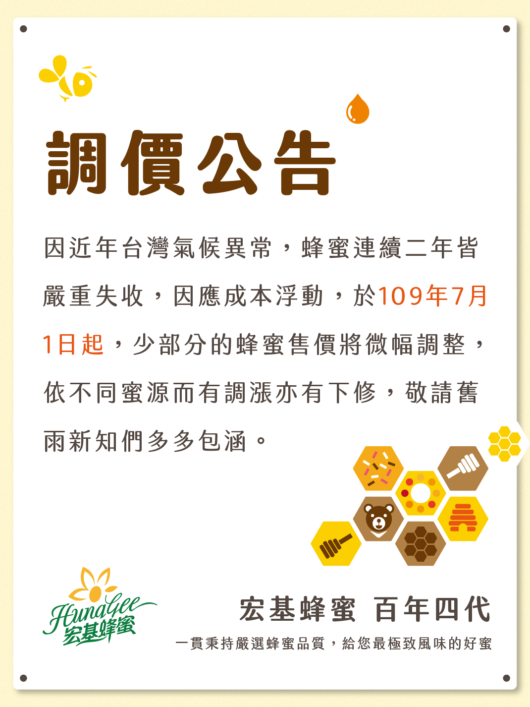 #調價公告因近年台灣氣候異常,蜂蜜連續二年皆嚴重失收,因應成本浮動,於109年7月1日起,少部分的蜂蜜售價將微幅調整,依不同蜜源而有調漲亦有下修,敬請舊雨新知們多多包涵。宏基蜂蜜 百年四代一貫秉持嚴選蜂蜜品質,給您最極致風味的好蜜。