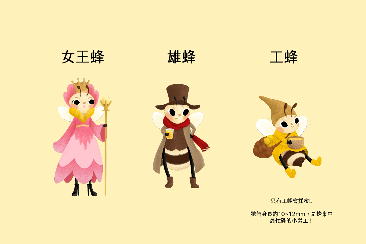 蜜蜂家族裡有三個成員,分別是女王蜂、雄蜂、工蜂。