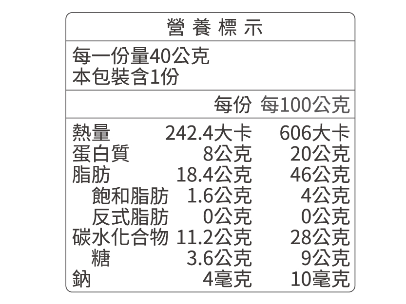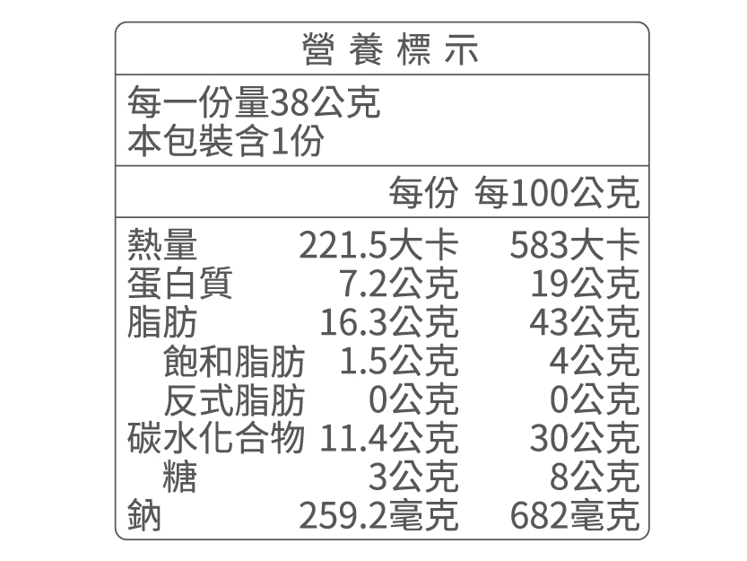 ●有效期限:出貨至少距離有效期限90日以上。●營養標示:詳見圖示資訊 ●保存方法:請置於陰涼乾燥處,避免陽光直射,開封後請儘速食用完畢。●注意事項:本產品與含麩質之穀物、花生、大豆、蛋類、奶類、堅果類、芒果、芝麻、種籽、奇異果及蕎麥的產品於同一工廠生產,對其食物過敏者請留意。
