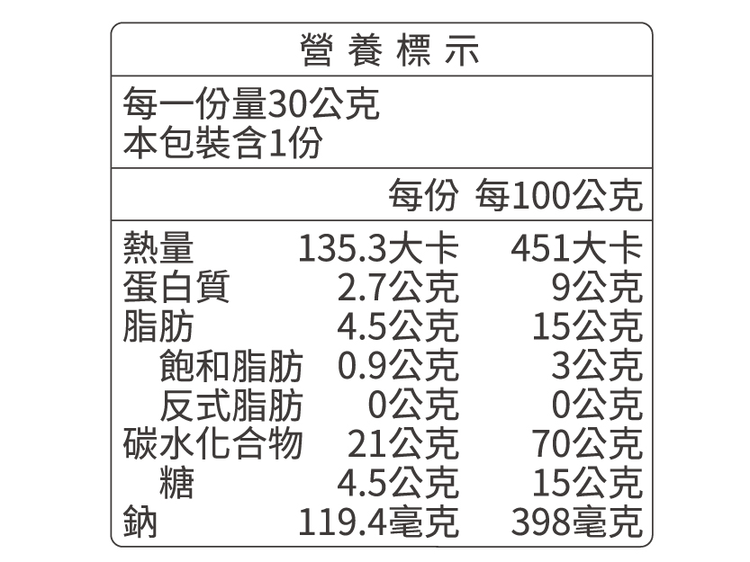 ●有效期限:出貨至少距離有效期限90日以上。●營養標示:詳見圖示資訊 ●保存方法:請置於陰涼乾燥處,避免陽光直射,開封後請儘速食用完畢。●注意事項:本產品與含麩質之穀物、花生、蛋類、堅果類、芒果、芝麻、種籽、奇異果及蕎麥的產品於同一工廠生產,對其食物過敏者請留意。