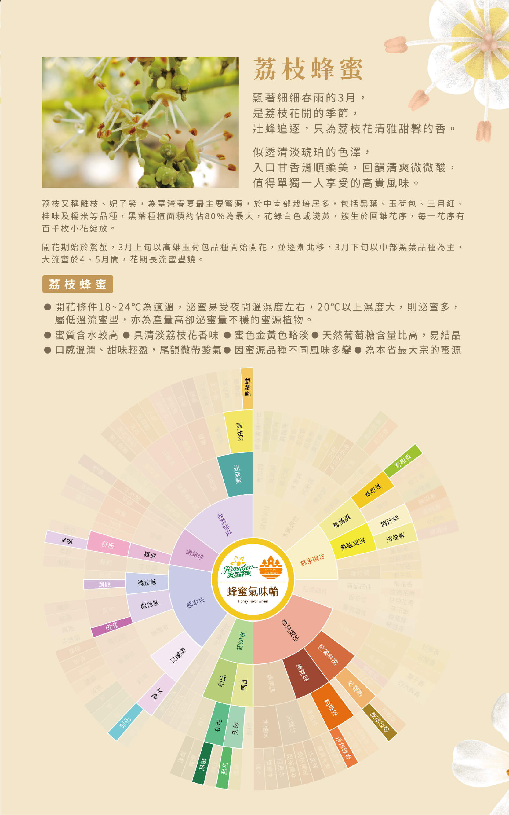 荔枝蜜味道帶點果香,甜度較龍眼蜜低,易結晶,是一款搭配紅茶很棒的蜂蜜。