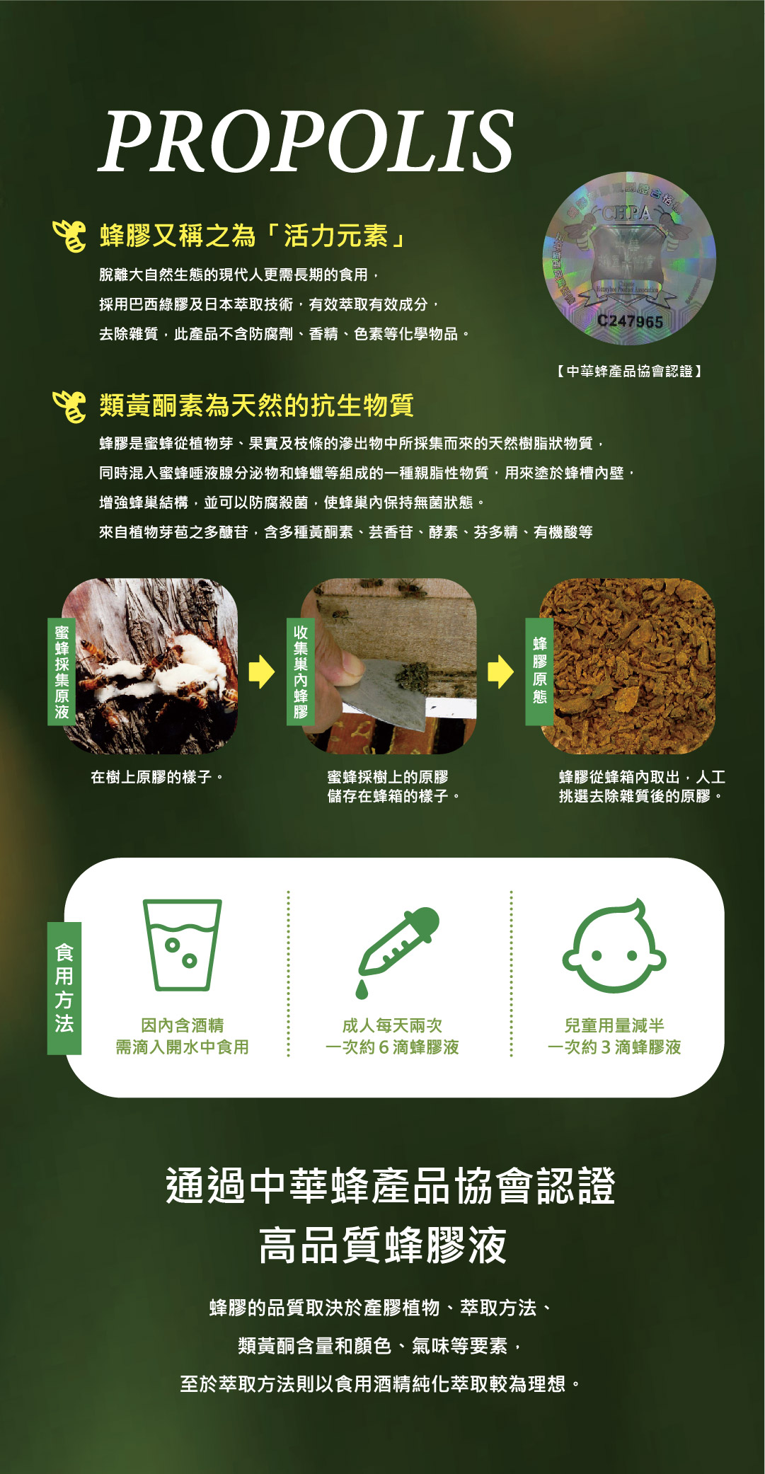 ●蜂膠的食用方法:▸避免直接食用,因內含酒精,需滴入開水中再食用。▸成人每天兩次,約 6 滴蜂膠液滴入溫開水服用,可依個人狀況增減。▸兒童減半使用。