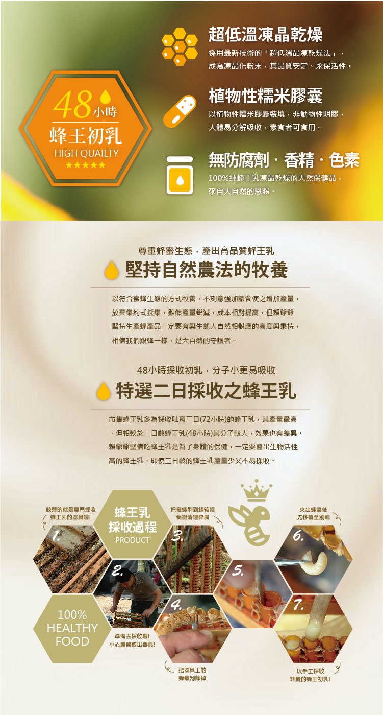★100%純蜂王乳凍晶乾燥的天然保健品。 ★無添加防腐劑、色素。 ★蜂王乳膠囊採用,超低溫凍晶乾燥技術,品質穩定。 ★膠囊採用→植物性糯米膠囊,素食者可食用。