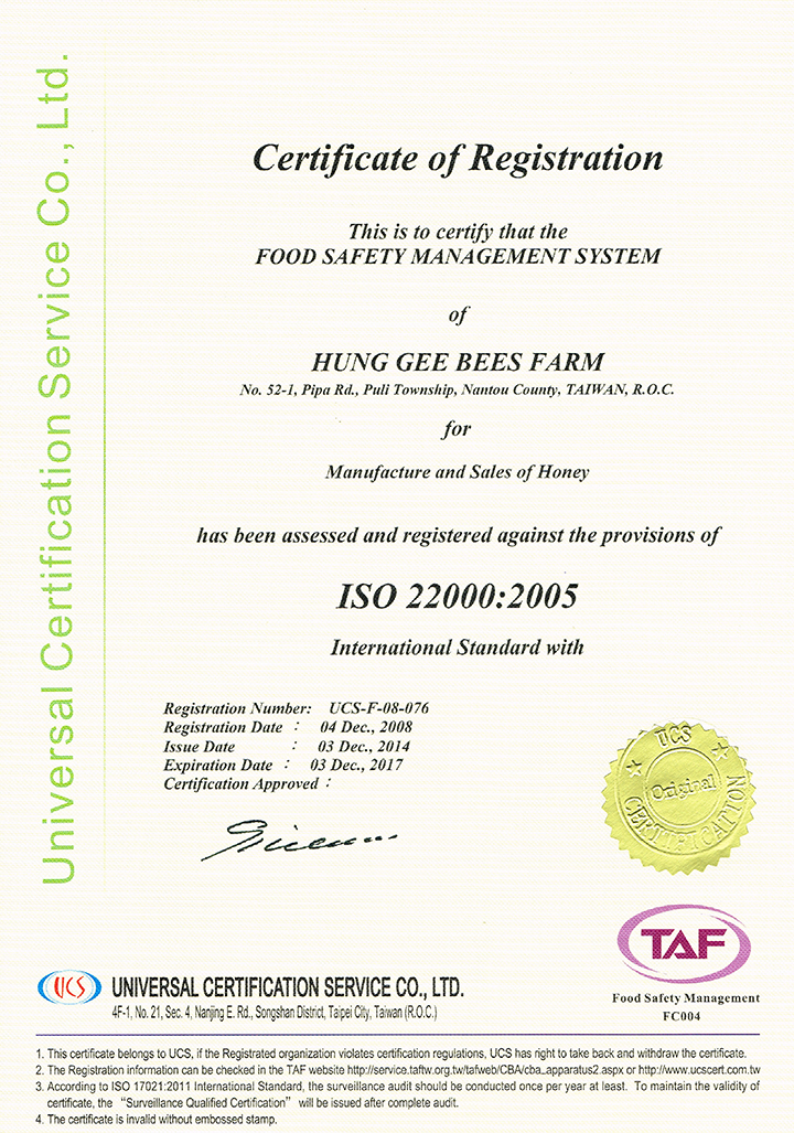 宏基蜜蜂生態農場 2014~2023年 ISO22000證書,我們提供您超過6年以上的過往證書參閱,向您保證我們不論何時為您提供的蜂蜜產品,皆符合國際食品安全規範。