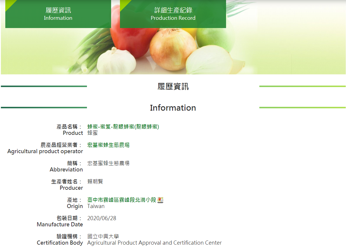 每一滴蜂蜜,在哪個蜂場採集、哪位蜂農管理,每次的採收、保存、檢驗、分裝等完整的「生產足跡」,都能在「產銷履歷農產品資訊網」查詢到!